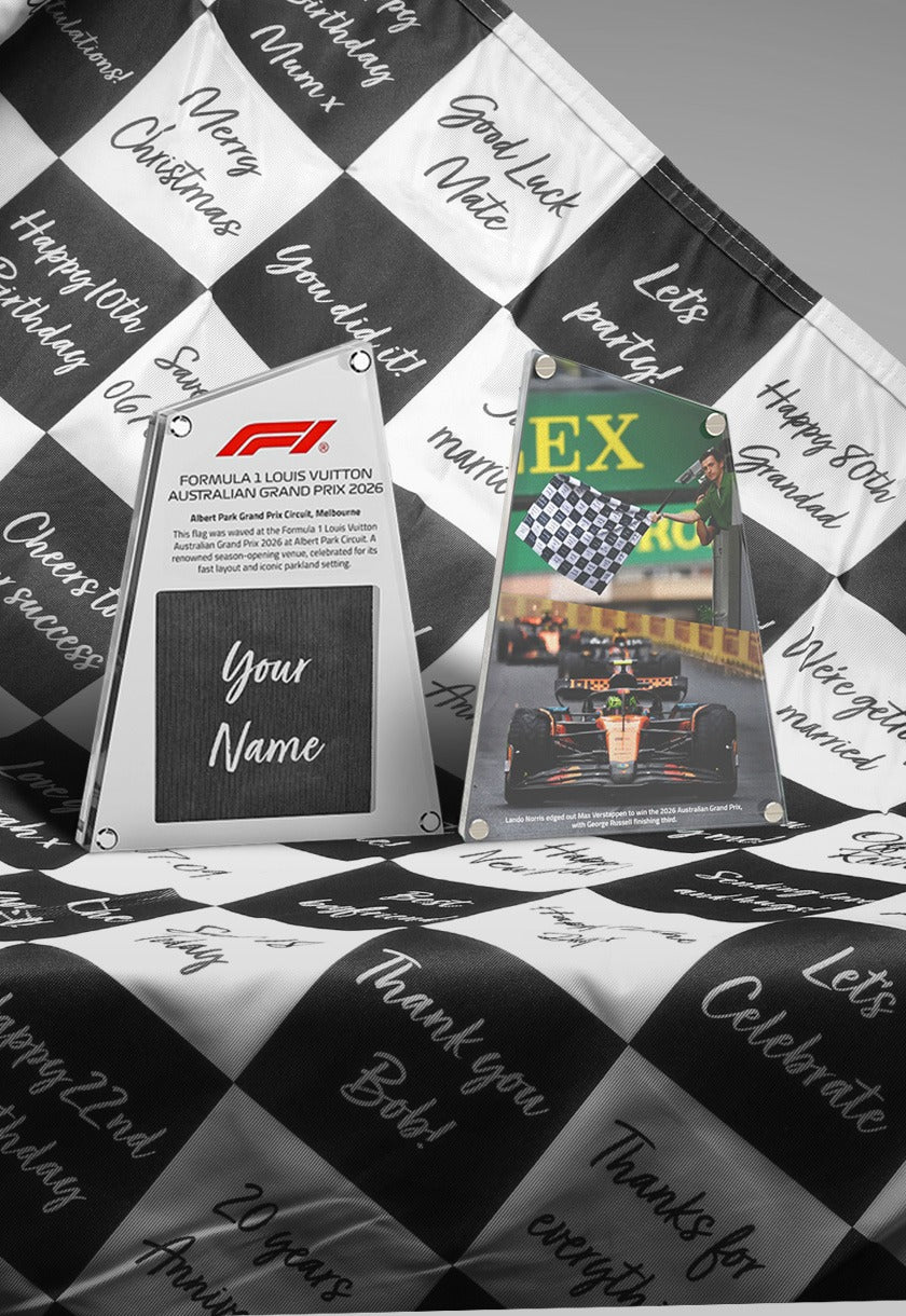 Each piece features an authentic, personalised square from the chequered flag waved as the winner crosses the finish line, hand cut and displayed just for you. Presented with a professional image of the race winner crossing the finish line, taken by an official F1 photographer.