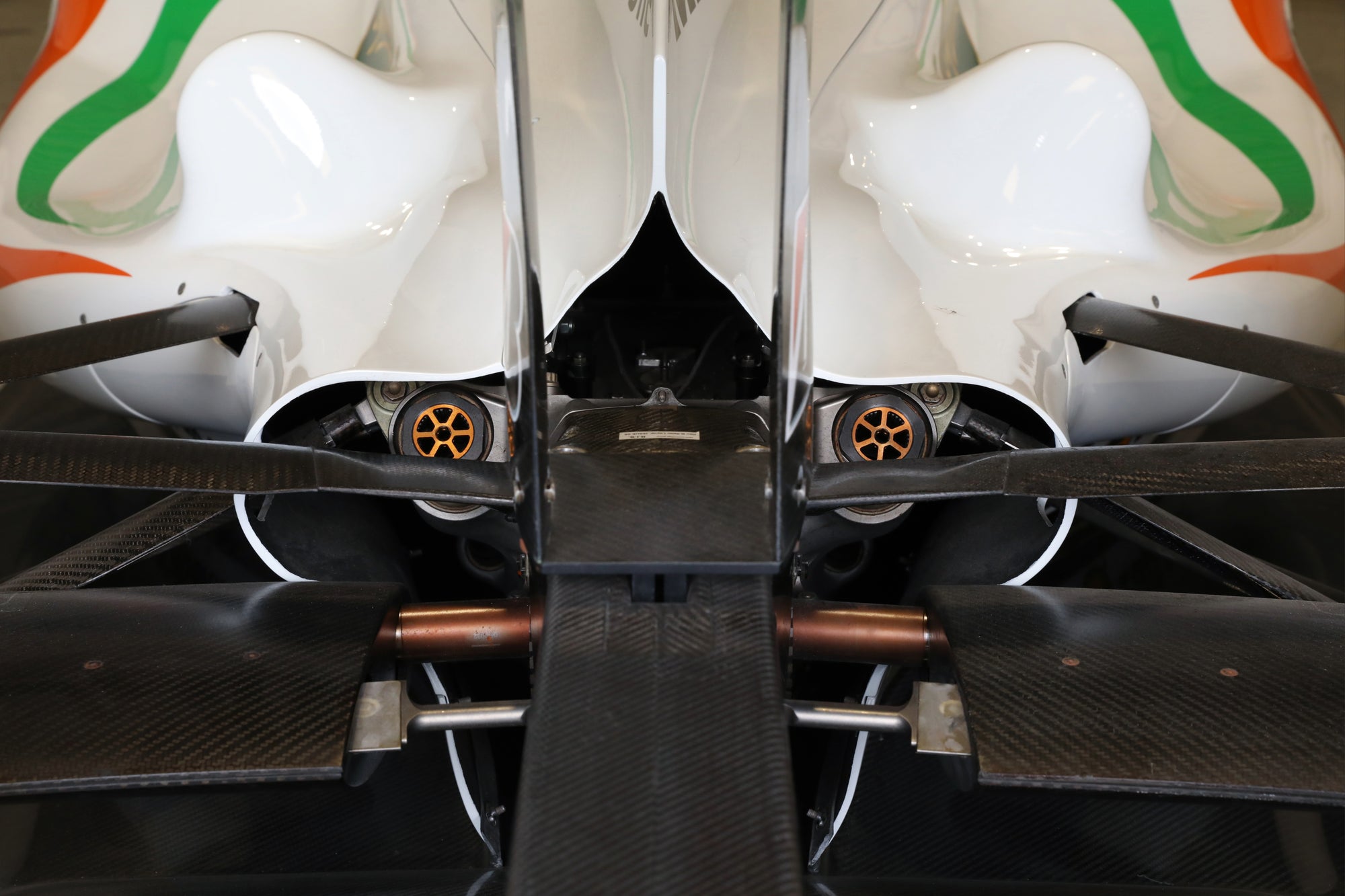 The tub connects to a Force India aluminium gearbox casing with part number “BOX Q-S01”. This casing has had all internals removed but retains the driveshafts which connect to the wheels.