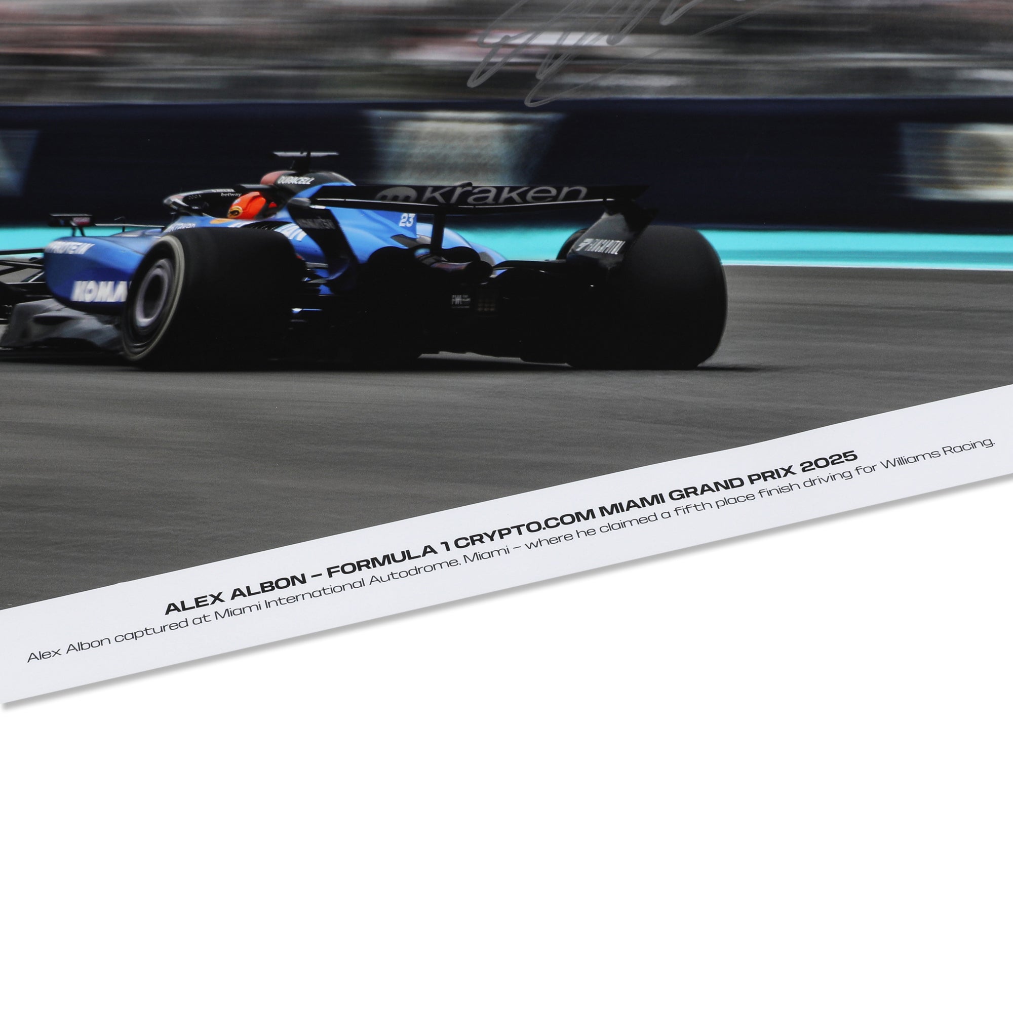 Capture the action! Own a photograph of Alex Albon out on track during the 2025 Miami Grand Prix, signed by the man himself.