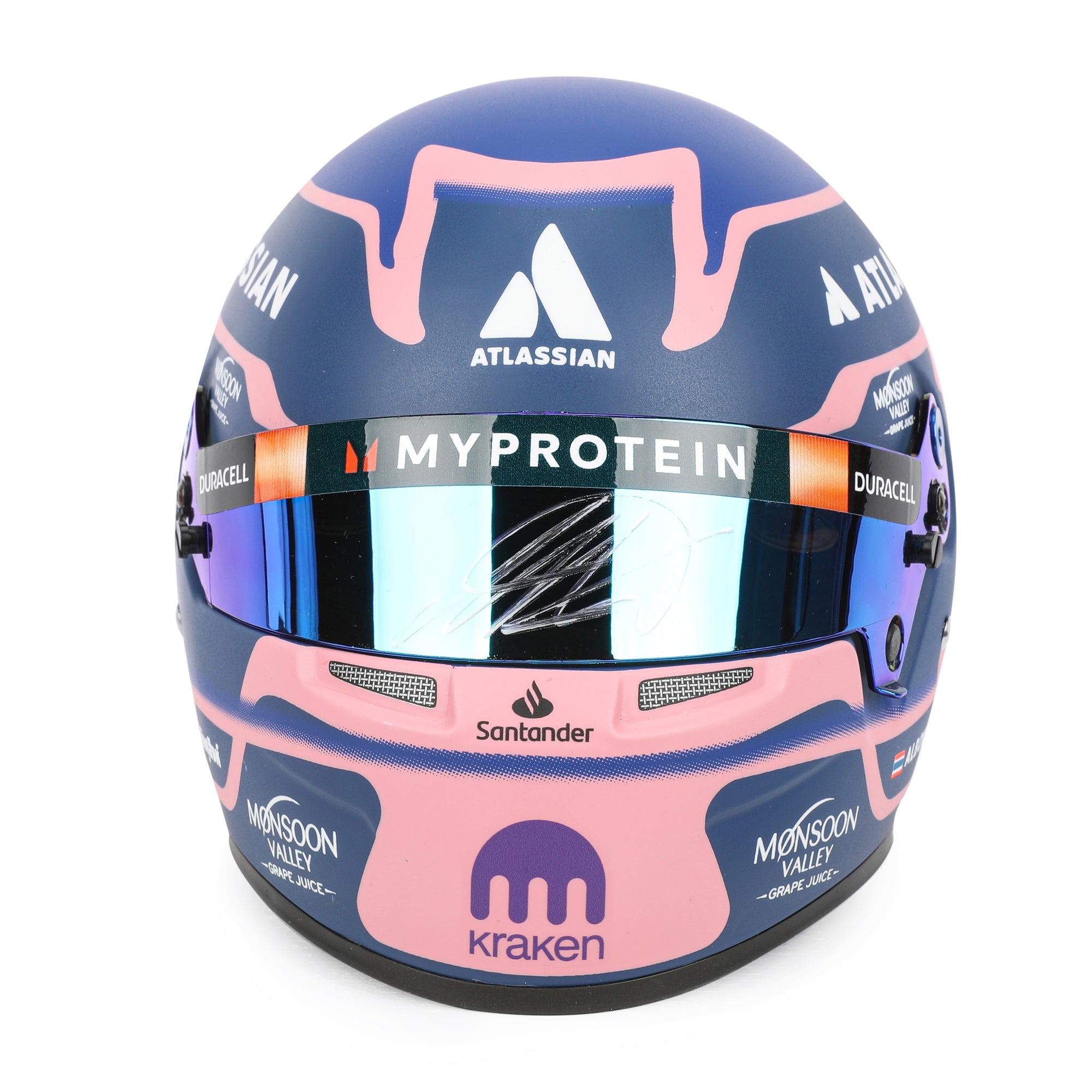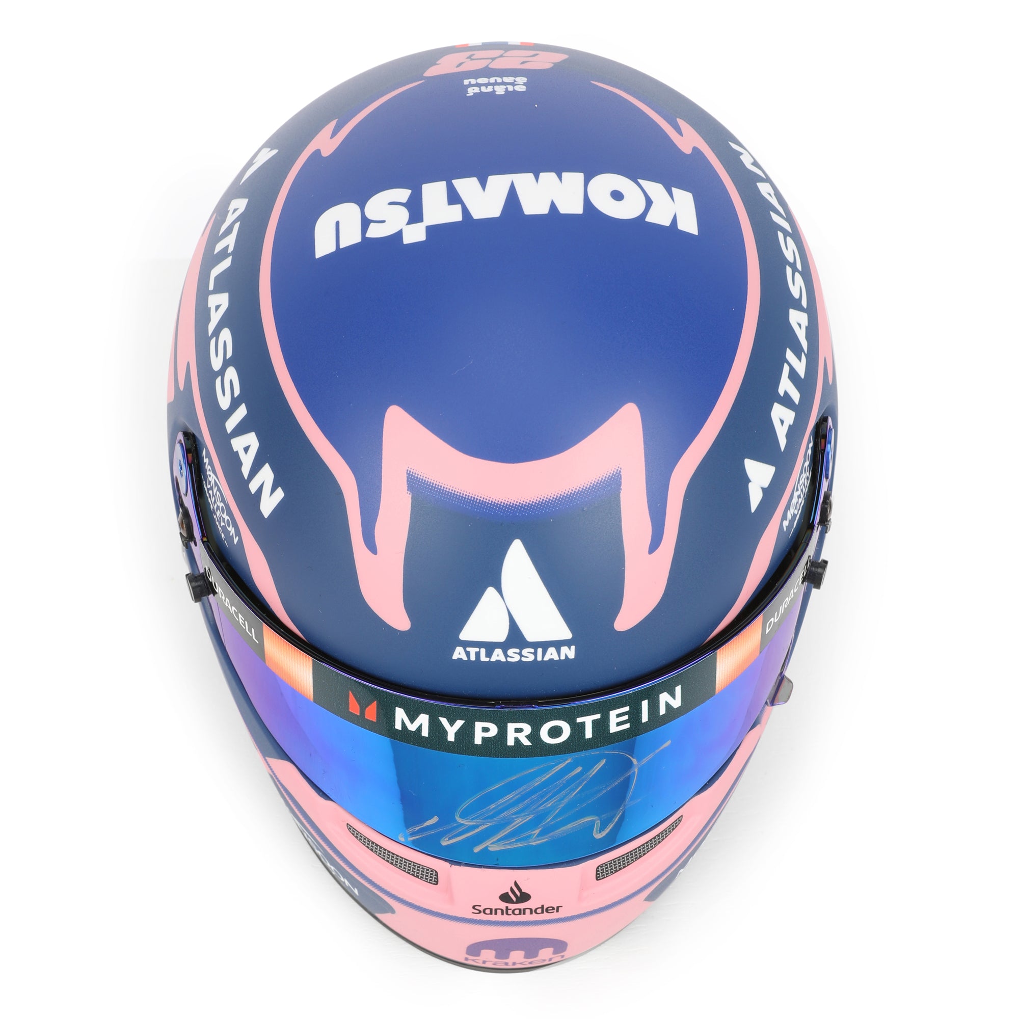 This 1:2 scale helmet has been created to replicate his official 2025 season design. Boasting the striking blue and pink detailing, alongside branding from Atlassian (Williams Racing’s title sponsor), My Protein, Komatsu and more, each miniature is reflective of his exciting year with the team.
