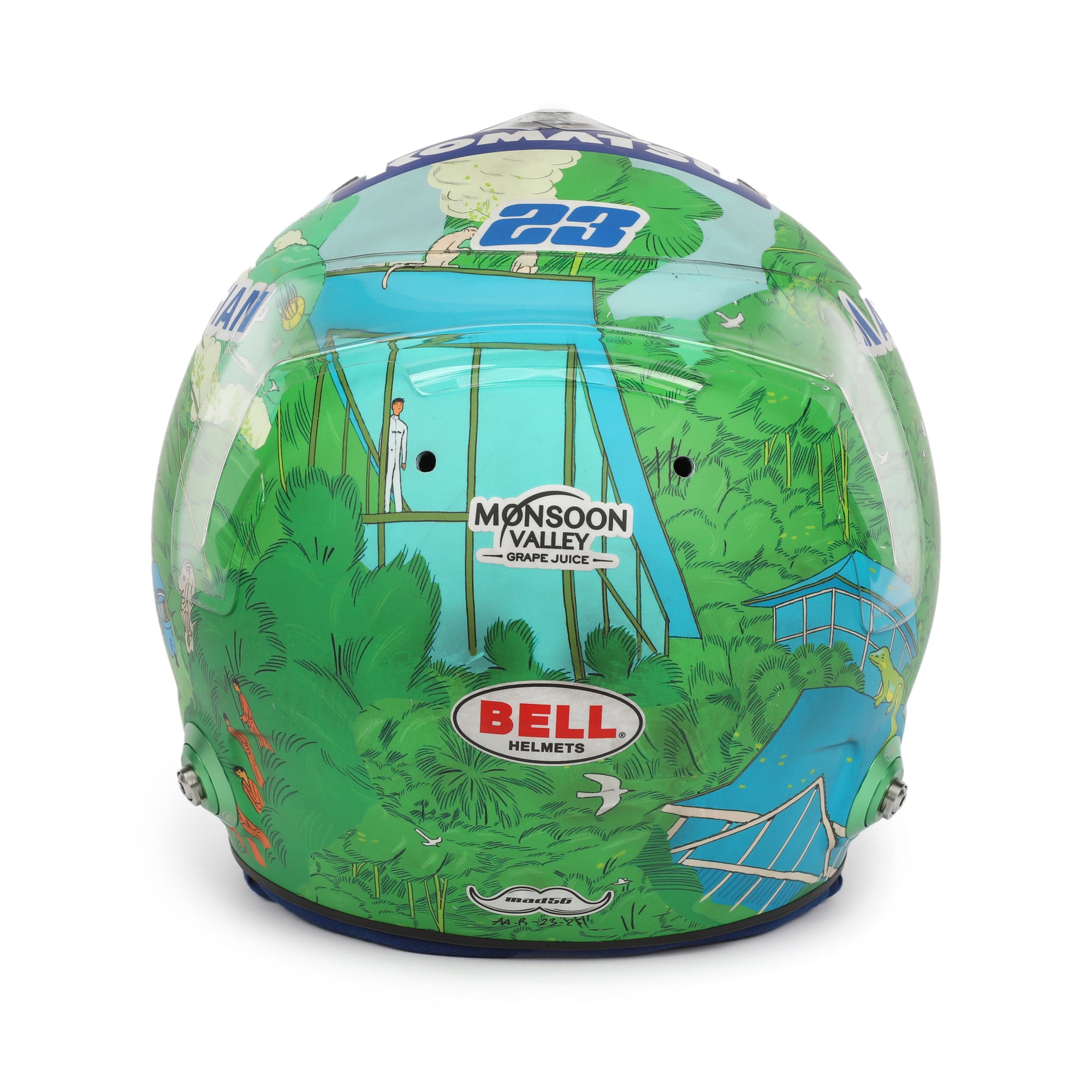 This bold and colorful helmet was specifically created for use at the 2025 Singapore Grand Prix. It was designed by Brooklyn-based artist and illustrator Karlotta Freier and features Thai and Asian inspired motifs, to celebrate Alex’s Southeast Asian heritage.