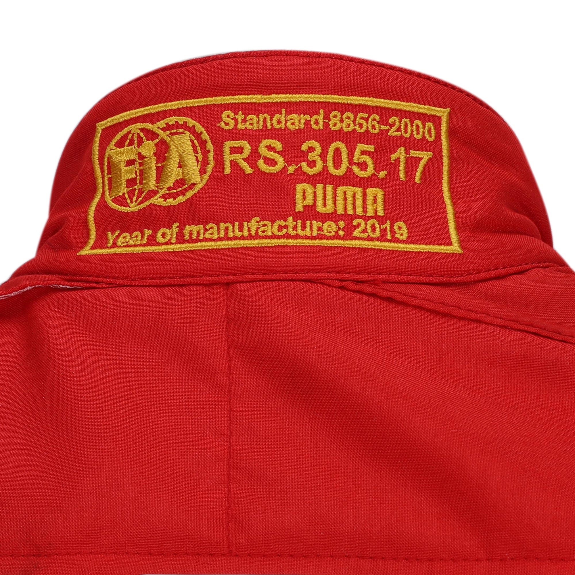 This race suit was worn by Leclerc during the 2019 season, and features the Ferrari red detailing, Scuderia branding and sponsor logos including Shell, UPS, and Mission Winnow.