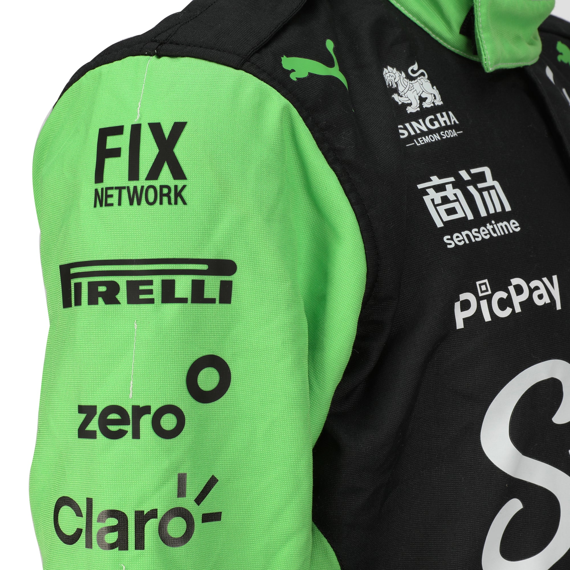 This authentic race suit was worn by Bortoleto during Grand Prix competition, showcasing the bold and distinctive Stake F1 Team Kick Sauber livery, complete with full team and partner branding and professional-grade construction engineered to meet the extreme demands of Formula 1 racing. Displaying clear signs of race use, the suit offers a direct and tangible connection to life inside the cockpit during a defining season in Bortoleto’s rapidly rising career.