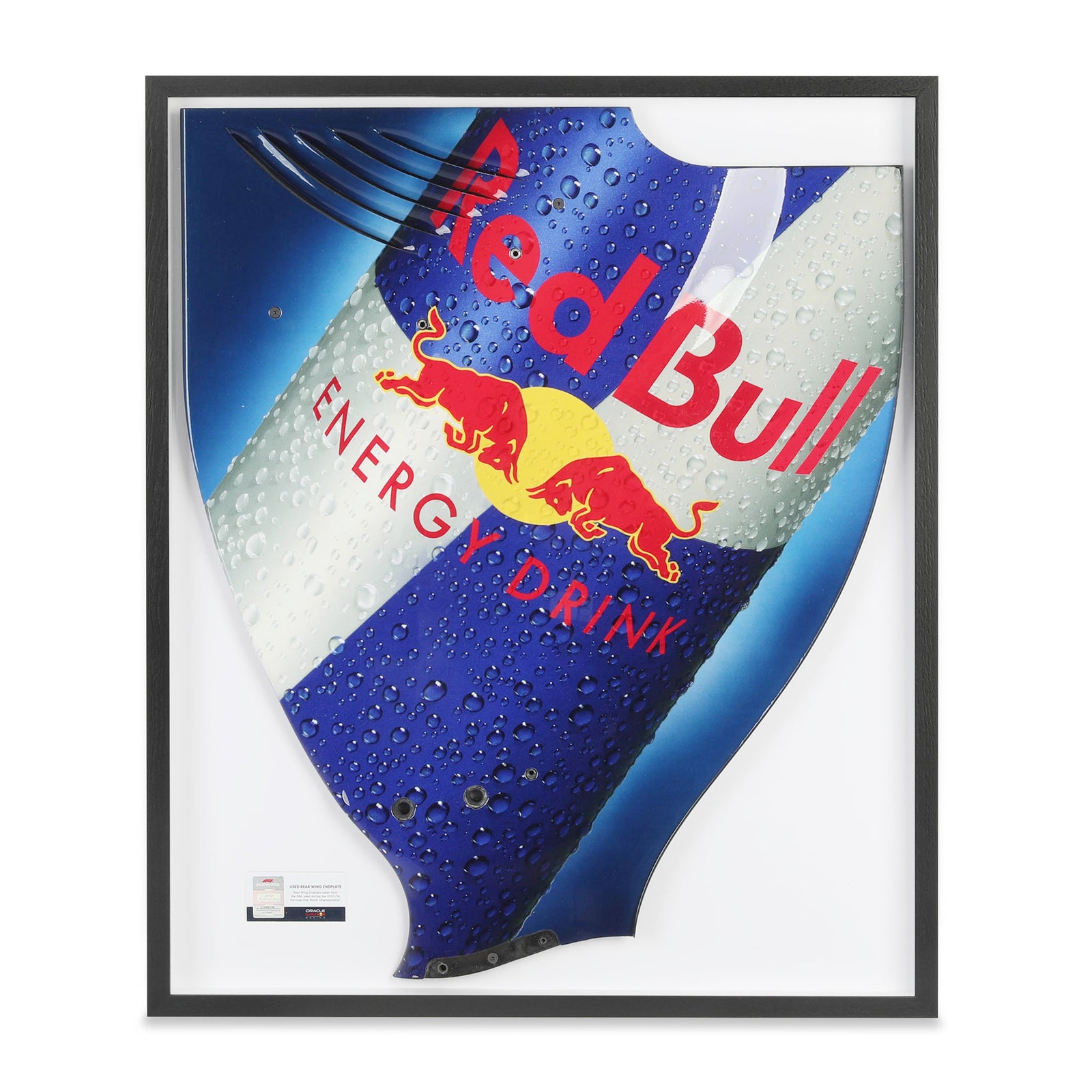The endplate features the iconic Red Bull livery with the iconic cold can of Red Bull printed on the endplate. Visible signs of race wear, including scuffs and scratches, add to its provenance, offering a tangible connection to the high-speed battles of the 2010 Formula 1 season.
