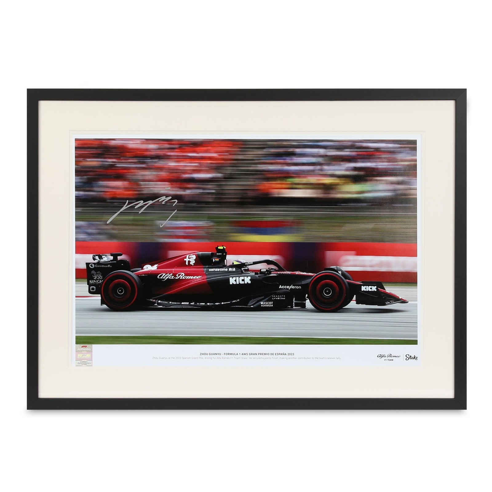 Zhou fans won’t want to miss this official photo, captured by renowned F1 photographer – James Moy. This photo captures Chinese F1 driver, Zhou Guanyu, at the 2023 Spanish Grand Prix, where he secured points for his team. Now featuring a signature from Zhou himself, this is a rare piece of F1 history.