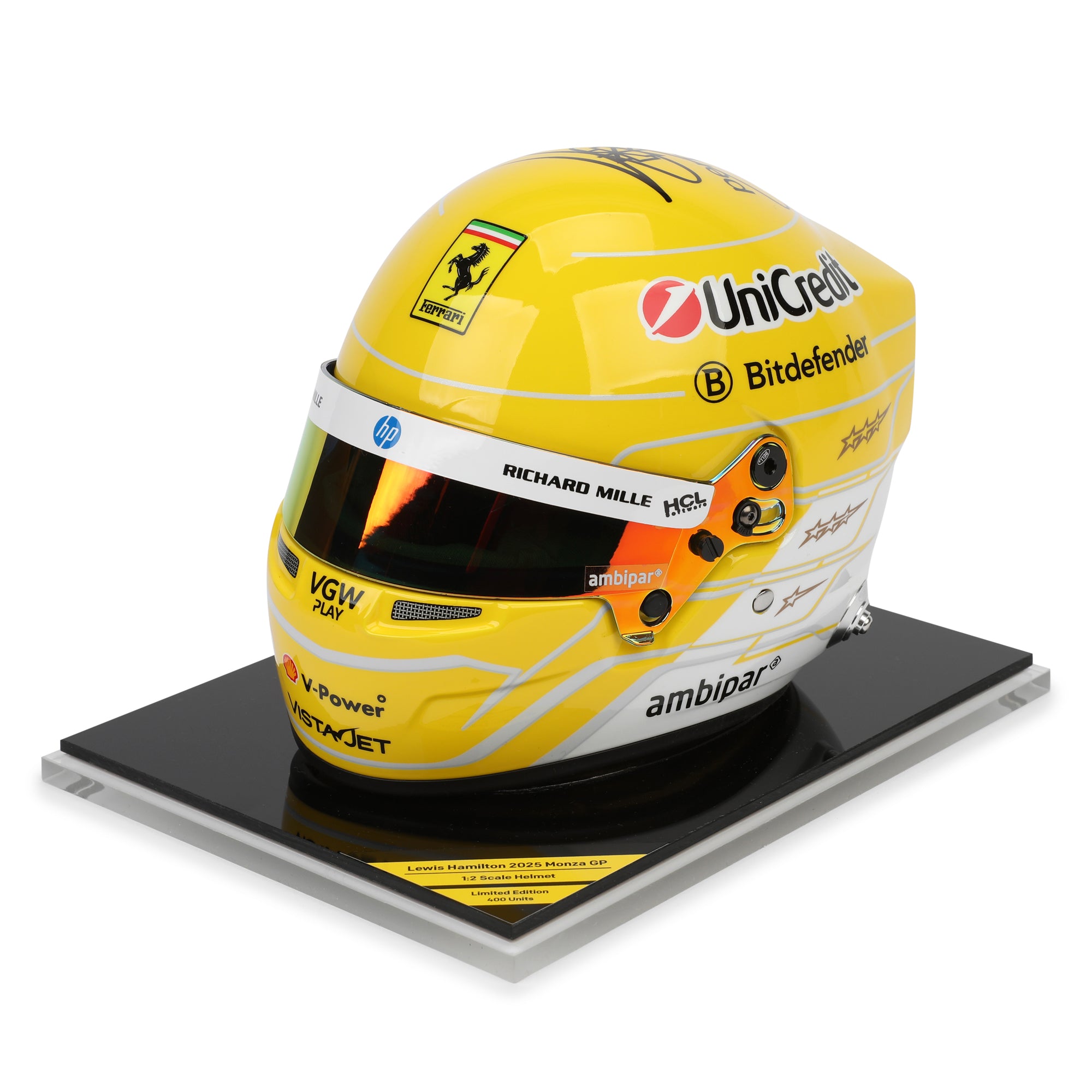 Featuring intricate graphics, official colourways, and accurate visor and helmet detailing, the mini helmet is a superb display piece for any Formula One collection. Hamilton’s autograph adds significant collectability, making this item a standout tribute to a legendary driver and the atmosphere of the Italian Grand Prix.