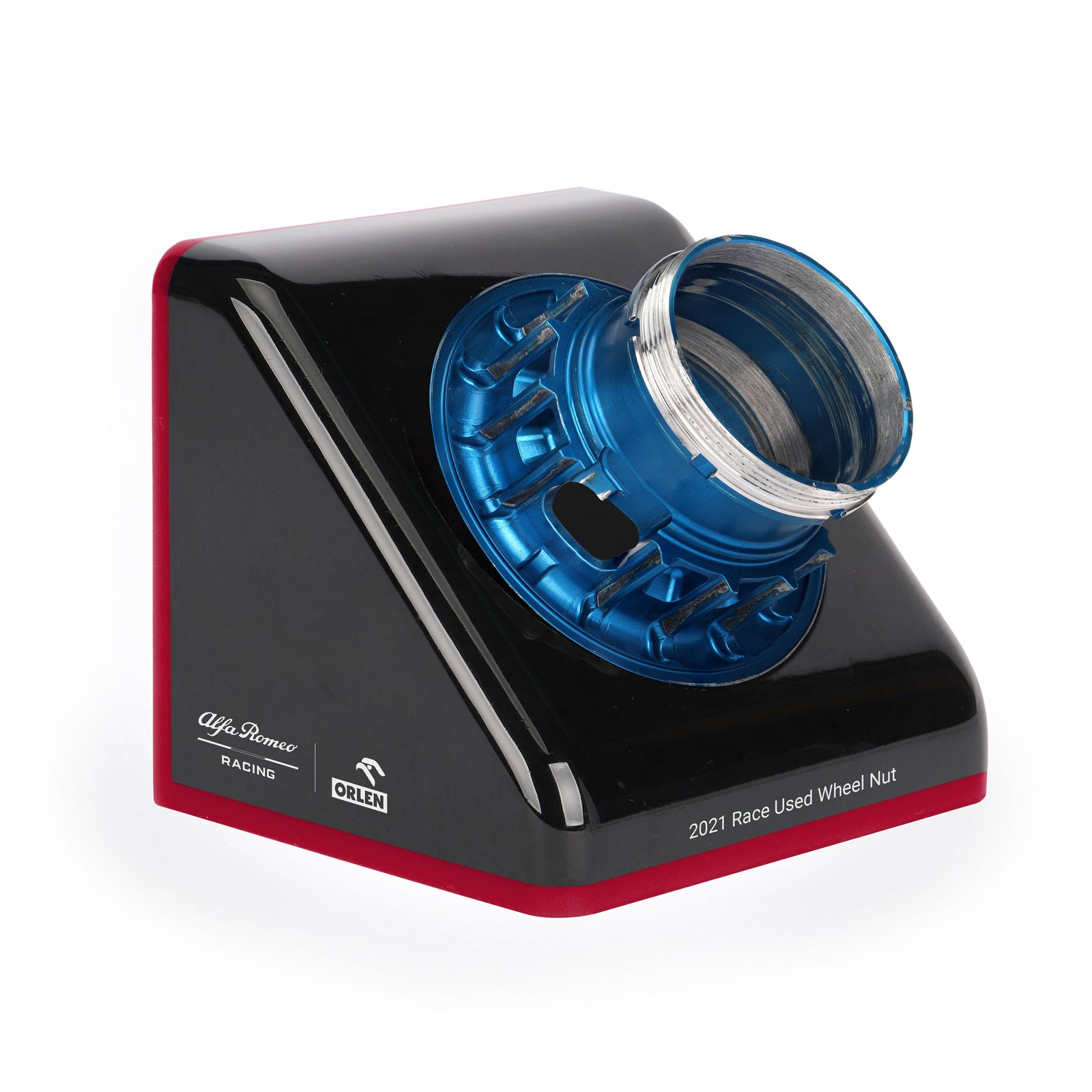 This original 2021 Alfa Romeo Racing C41 wheel nut will make the perfect addition to any growing F1 collection. Displayed in a sleek case, this right-hand wheel nut is a piece of F1 history.