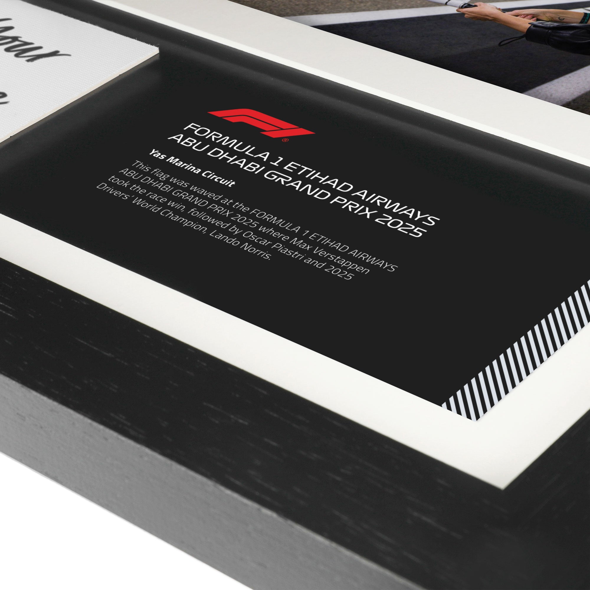 - We hand cut each square and professionally frame it, along with a photograph specific to race it was waved at taken by a professional F1 photographer