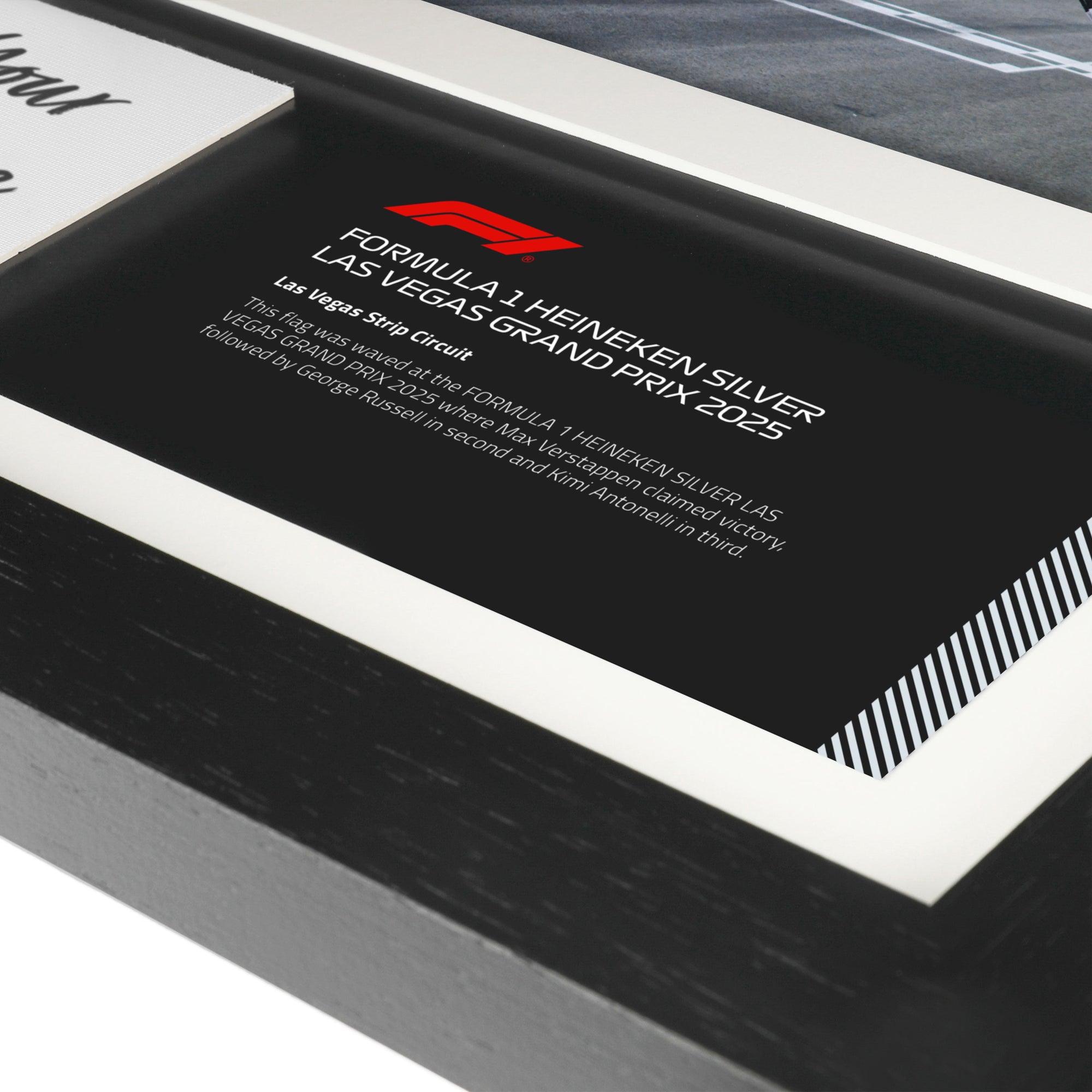 - We hand cut each square and professionally frame it, along with a photograph specific to race it was waved at taken by a professional F1 photographer