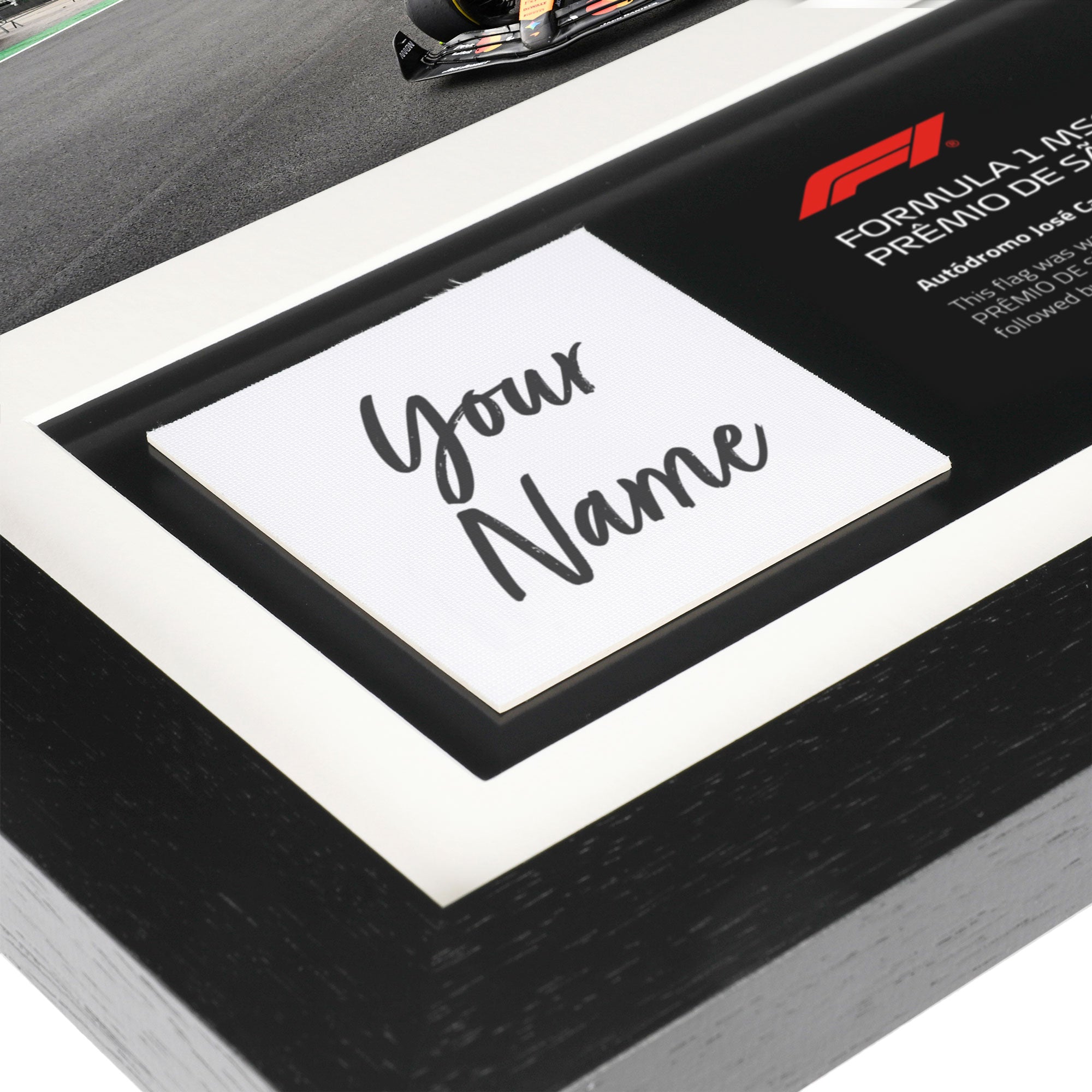- We hand cut each square and professionally frame it, along with a photograph specific to race it was waved at taken by a professional F1 photographer