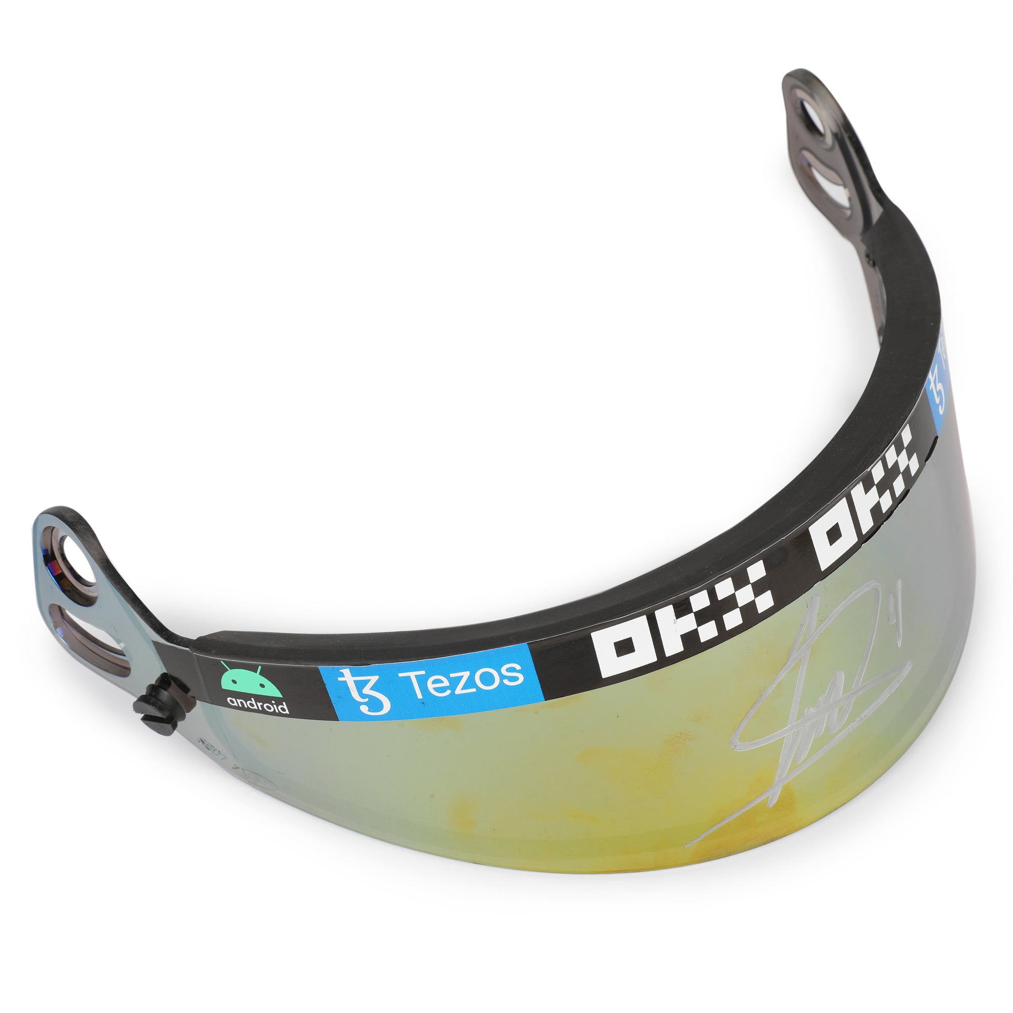 Helmet visors are a vital component of a driver’s race equipment, engineered from high-strength polycarbonate to withstand debris impacts at speeds exceeding 200mph while maintaining perfect optical clarity. Acting as the protective shield between driver and track environment, the visor is central to every lap of a Grand Prix weekend.