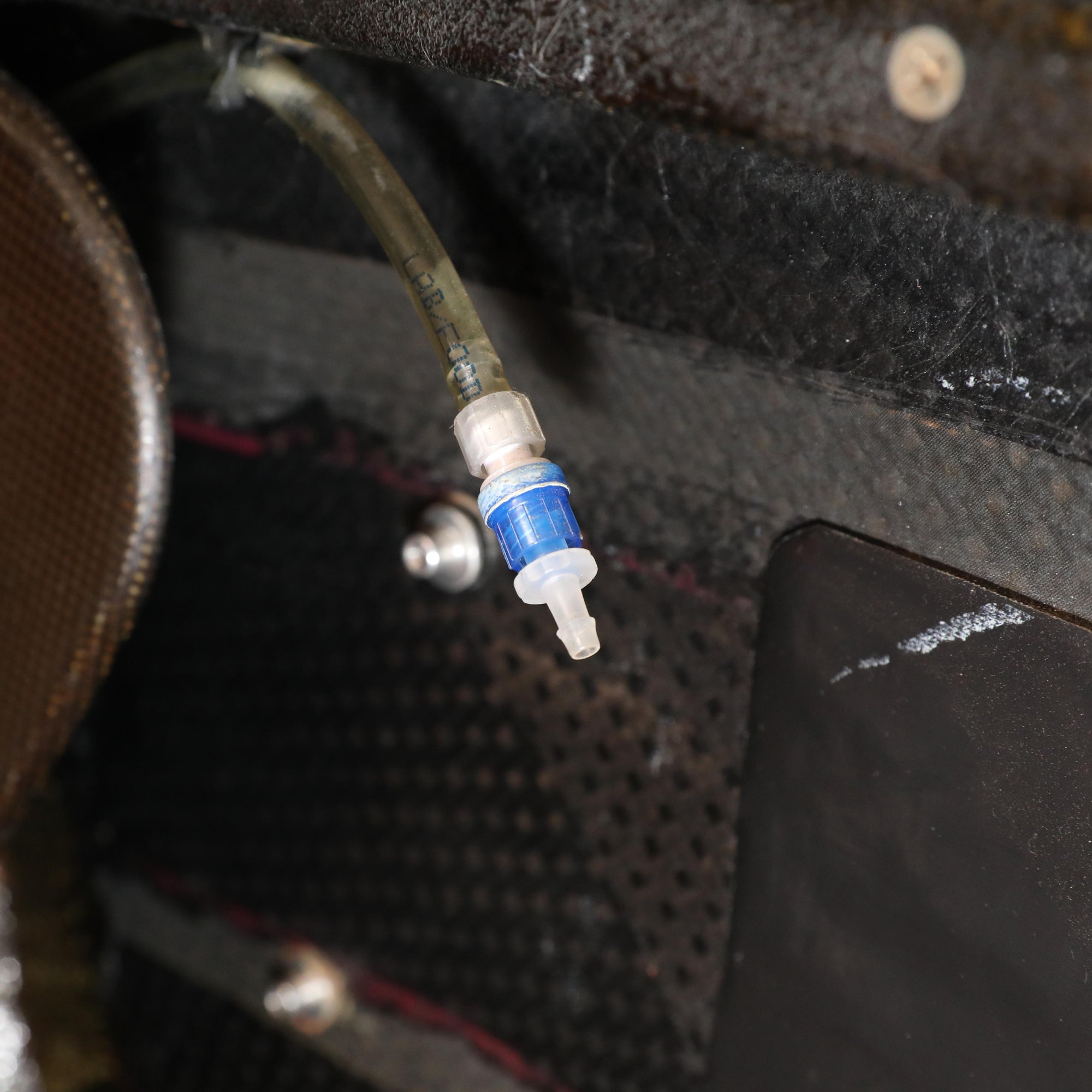 The cockpit is complete with a race-used steering wheel, drinks tube and seat. Lifting the seat reveals that wiring looms and electronic enclosures remain in place, excluding the ECU, electronics and all F1®-mandated sensors, loggers and chassis driver switches. The FIA-mandated extinguisher system also remains in place.