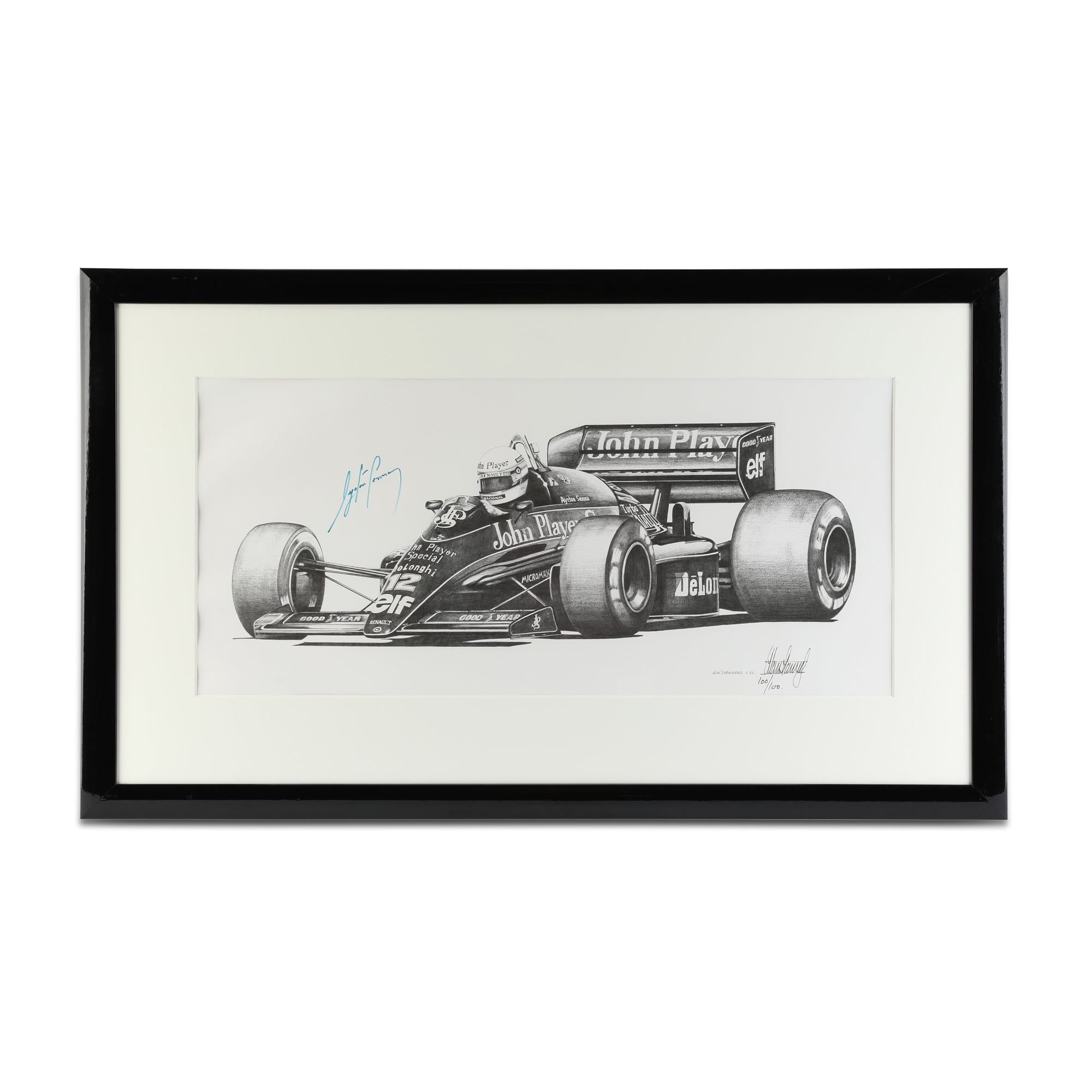 Personally signed by Ayrton Senna, this print carries exceptional historical and emotional significance. Signed Senna pieces remain among the most sought-after in all of motorsport memorabilia, combining rarity, legacy and enduring global appeal.
